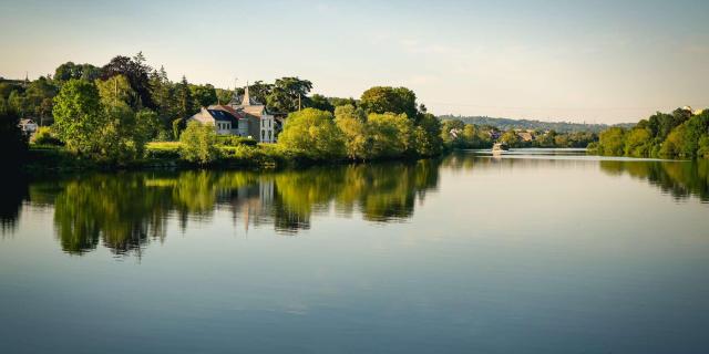 Vue sur la Meuse et deux de ses ponts, sur la droite la maison Batta